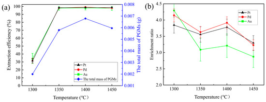 The extraction efficiency of Pt, Pd, and Au, as well as the total mass of the PGMs (a) and the enrichment ratios of Pd, Pt, and Au (b), as a function of temperature.
