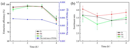 The extraction efficiency of Pt, Pd, and Au, as well as the total mass of PGMs (a) and the enrichment ratios of Pd, Pt, and Au (b), as a function of time.