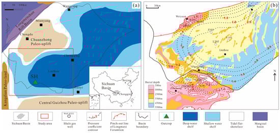 (a) The location and sedimentary environment of the study area during Early Silurian [22,23]. (b) Distribution characteristics of burial depth and pressure coefficient of shale formations in the Longmaxi Formation [24].