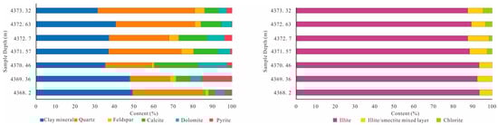 Multiple deep marine shale samples from the Longmaxi Formation in the Sichuan Basin, Southwest China, were collected for an analysis of mineral composition and pore structure. The samples in this study were subjected to X-ray diffraction (XRD) and argon ion polishing scanning electron microscopy (SEM) experiments. The XRD testing was conducted using an X-ray diffractometer (Panaco Aeris, Malvern Panalytical Ltd., Worcestershire, UK), with sample sizes smaller than 200 mesh and dried for 24 h at 70 °C in a heating oven to remove moisture from the sample. Then, the dried powder samples are coated on the glass slides for XRD testing. The relative mineral content of shale samples was directly calculated by the SwiftMin software (version 1.4.66) using XRD spectra. The SEM testing was performed using the FIB/SEM Helios NanoLab 660 dual-beam scanning electron microscope (Helios NanoLab 660, produced by FEI company, Hillsboro, OR, USA).