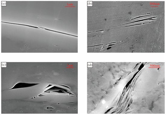 Scanning electron microscope photographs of deep marine shale in the Longmaxi Formation. (a) silt-like intercrystalline pore in illite, Well W204, 3525.81 m. (b) silt-like intercrystalline pore in I/S mixed layer, Well W204, 3523.73 m. (c) silt-like and wedge intercrystalline pore in illite, Well W204, 3521.55 m. (d) silt-like intercrystalline pore in illite, Well L204, 3520.47 m.