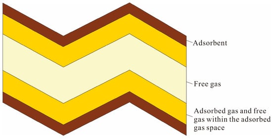 Under supercritical conditions, when the temperature is constant, the difference between the absolute adsorption capacity and the excess adsorption capacity increases as pressure rises. This is because as pressure increases, the density of the free-phase gas increases, and the difference between the free-phase gas density and the adsorbed-phase gas density decreases, causing the difference between excess adsorption and absolute adsorption to become larger. When the pressure is sufficiently high, the density of free methane exceeds that of adsorbed methane, and the excess adsorption can become negative [30,31]. The molecular simulation result is the total gas capacity, which includes both adsorbed gas capacity and free gas capacity within the pore space. Moreover, the MS software is unable to obtain the adsorbed gas volume, so the excess adsorption capacity cannot be calculated using Equation (1), and it should be modified. The schematic diagram of gas distribution in shale pores under supercritical conditions is shown in Figure 6. The gas within the pores is divided into three parts: adsorbed gas, free gas, and free gas within the adsorbed gas space. The molecular simulation results correspond to the total of these three parts. Free gas is extensively distributed in the shale pore space, so excess gas adsorption can be represented as the difference between the total gas capacity in the shale and the free gas capacity. The pore space in the simulation model corresponds to the free volume in the model, so Equation (1) can be revised and expressed in Equation (2).