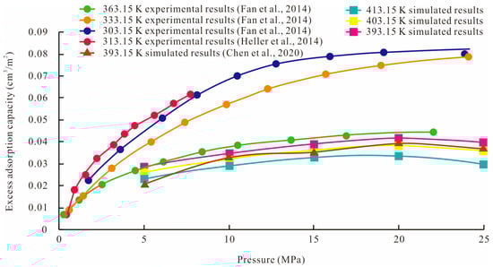 The results of molecular simulations are influenced by factors such as the crystal structure of the simulation model, the chosen force field type, and the force field parameters. Therefore, comparison with methane isothermal adsorption experimental data is necessary to validate the model and parameter rationality. However, the simulation model has uniform pore sizes, a simple pore structure, and a specific surface area much higher than that of natural minerals, so the simulated results are much higher than the experimental results, making direct comparison impossible [17,34]. Previous studies have indicated that the adsorption capacity of adsorbent is mainly influenced by the surface area, so the simulation results can be converted to adsorption amounts per unit surface area of the adsorbent [17]. The comparison of the converted simulated and experimental excess adsorption capacity is shown in Figure 7. While there is some discrepancy between the experimental and simulation results, they fall within the same order of magnitude, and the trends are similar. The reasons for the differences may be as follows: (1) The MS software determines the free volume within the simulation model using He atoms. Since the atomic diameter of He is smaller than that of methane molecules, the free volume calculated is larger than it should be [35]. (2) Differences in temperature and pressure conditions between the experiments and simulations result in discrepancies between them. (3) The simulation model uses ideal mineral crystals, while natural mineral samples in actual experiments contain impurities, and their crystal structures are not ideal, with lattice defects and isomorphous substitution. (4) The pore structure in the simulation model is relatively simple, consisting of slit-like pores, while the pore structure in actual minerals is much more complex, and the pore morphology can influence the adsorption capacity. In general, the simulation results are of the same order of magnitude as the experimental results, confirming the validity of the model and parameter selection (Figure 7).