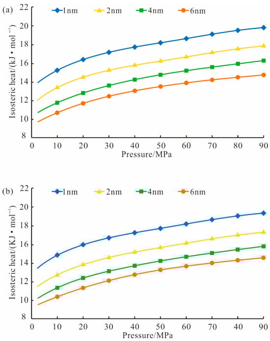 The methane isosteric adsorption heat is a key parameter for characterizing the adsorption capacity of shale, representing the comprehensive result of reaction energy changes in the adsorption process [39]. Additionally, isosteric adsorption heat varies with the absolute adsorption capacity of methane [40]. In this study, the isosteric heat of adsorption for illite simulation models of 1 nm, 2 nm, 4 nm, and 6 nm under varying temperature and pressure conditions was calculated based on the simulation results. Figure 8 demonstrates that the isosteric adsorption heat for the methane adsorption process in the illite and quartz simulation models under various temperature and pressure conditions was below 42 kJ/mol, indicating that the adsorption of methane in illite belongs to physical adsorption [41]. The isosteric adsorption heat of illite and quartz, in descending order, is illite > quartz, indicating that illite has a stronger methane adsorption capacity than quartz. Additionally, the adsorption heat gradually increases with rising pressure. This phenomenon suggests that the adsorbed methane capacity in the slit increases with rising pressure, resulting in the release of more heat. Additionally, isosteric adsorption heat increases with decreasing pore size; this can be explained by the adsorption potential theory. In the simulation model, the pore walls with smaller pore sizes are closer together, and the adsorption potential overlaps between the pore walls, exerting a stronger force on methane molecules than in wider pore sizes. This leads to greater isosteric adsorption heat.