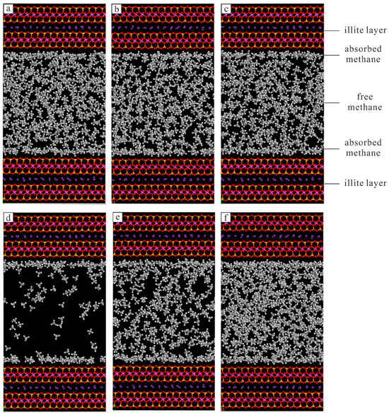 (a) Methane simulation results of 4 nm illite simulation model under 393.15 K, 40 Mpa. (b) Methane simulation results of 4 nm illite simulation model under 403.15 K, 40 Mpa. (c) Methane simulation results of 4 nm illite simulation model under 413.15 K, 40 Mpa. (d) Methane simulation results of 4 nm illite simulation model under 403.15 K, 10 Mpa. (e) Methane simulation results of 4 nm illite simulation model under 403.15 K, 30 Mpa. (f) Methane simulation results of 4 nm illite simulation model under 403.15 K, 90 Mpa.