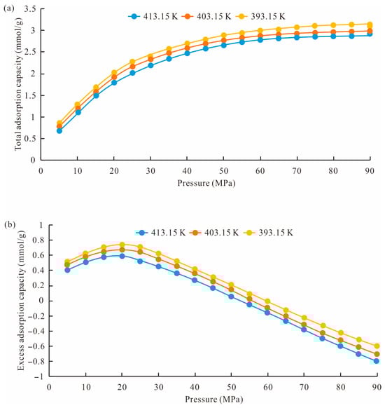 The methane adsorption results directly reflect the distribution of methane in the simulation models; however, they do not accurately represent the methane adsorption capacity. Based on the methane adsorption simulation results, methane adsorption curves for the two simulation models at different temperatures were plotted in this study. As shown in Figure 10, with increasing temperature, both the total methane adsorption capacity and the excess adsorption capacity in illite decrease. When the pressure reaches 50 MPa, the total adsorption capacity of the illite simulation model is 5.252 mmol/g at 393.15 K, 5.150 mmol/g at 403.15 K, and 4.982 mmol/g at 413.15 K. Therefore, methane adsorption is an exothermic process. The kinetic energy and the ability of methane molecules to move freely increase with rising temperature, allowing more adsorbed methane molecules to overcome the pore wall adsorption potential and transition into the free phase [12,42]. The morphology of the total methane adsorption curve at different temperatures remains largely consistent, and the effect of temperature on the total adsorption capacity is slightly stronger at higher pressures than at lower ones. This suggests that the number of methane molecules in the simulation model under high pressure exceeds that under lower pressure, and more methane molecules are affected by higher temperatures. Additionally, there are differences among the total methane adsorption curves at different temperatures, with the curve at higher temperatures showing a lower value than that at lower temperatures. This indicates that the effect of temperature on methane adsorption capacity decreases at higher temperatures.