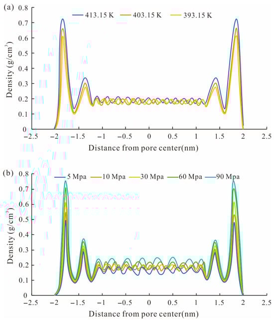 To investigate the density distribution of methane molecules in illite slits under different temperatures and pressures, methane density distribution curves at 5, 10, 30, 60, and 90 MPa at 403.15 K, and at 393.15 K, 403.15 K, and 413.15 K at 40 MPa are plotted based on the 4 nm illite slit simulation results. Figure 11 demonstrates that the methane density distribution curve is approximately symmetrically distributed along the simulation model, and maximum values appear on both sides of the curve, corresponding to the main adsorbed methane layers shown in Figure 9. Additionally, a secondary adsorbed methane layer appears in the methane density distribution curve. The free methane molecules are affected by superimposed adsorption potential between the main adsorbed layer and the illite pore wall, which restricts their movement and leads to the formation of a secondary methane adsorbed layer. It can also be attributed to the chosen simulation parameters [33]. The density of the secondary adsorbed layer is significantly lower than that of the main adsorbed layer, but higher than the free methane density in the slit center. Therefore, we believe that double-layer adsorption is a characteristic of methane adsorption in deep marine shale. As temperature increases, the density of the adsorbed methane layer decreases, measuring 0.714 g/cm3 at 393.15 K, 0.694 g/cm3 at 403.15 K, and 0.644 g/cm3 at 413.15 K, while the density of free methane increases slightly. Furthermore, the methane density in the slit increases with pressure, and the methane growth rate is faster at lower pressures. At lower pressures, the methane adsorption capacity in the slit is small, and intermolecular repulsion is weak. As pressure rises, the total methane adsorption capacity increases rapidly, and intermolecular repulsion correspondingly increases. Thus, the total methane capacity tends to stabilize at high pressure. In summary, high temperatures are unfavorable for methane adsorption in shale, while high pressure benefits the total adsorption capacity.