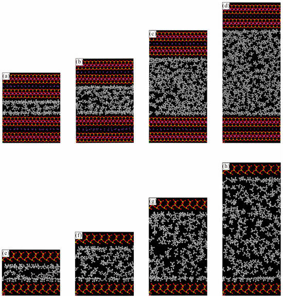 (a) Simulation results of 1 nm illite simulation model under 403.15 K, 30 MPa. (b) Simulation results of 2 nm illite simulation model under 403.15 K, 30 MPa. (c) Simulation results of 4 nm illite simulation model under 403.15 K, 30 MPa. (d) Simulation results of 6 nm illite simulation model under 403.15 K, 30 MPa. (e) Simulation results of 1 nm quartz simulation model under 403.15 K, 30 MPa. (f) Simulation results of 2 nm quartz simulation model under 403.15 K, 30 MPa. (g) Simulation results of 4 nm quartz simulation model under 403.15 K, 30 MPa. (h) Simulation results of 6 nm quartz simulation model under 403.15 K, 30 MPa.