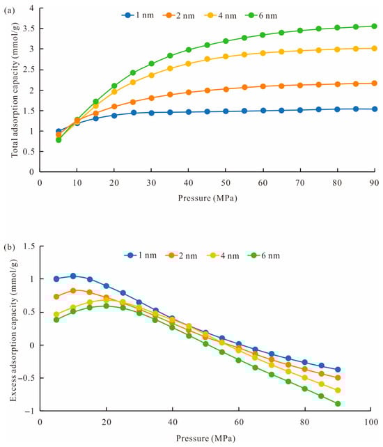 The simulation results shown in Figure 12 indicate that as pore size increases, the reservoir space in the simulation model also increases, leading to a corresponding rise in free methane capacity, while the amount of adsorbed methane remains relatively constant. However, the simulation results cannot quantitatively describe the distribution of adsorbed methane. Therefore, the total methane adsorption capacity, which increases with pore size, was plotted. As shown in Figure 13, the total methane adsorption capacity increases with pore size. Additionally, the larger the pore size, the faster the rate of increase in total methane adsorption capacity. Larger pores provide more space for accommodation. As pressure increases, more methane molecules are required to fill the reservoir space, thus offsetting the simulated pressure. In addition, the methane excess adsorption capacity is also influenced by pressure. The pressure at which excess methane adsorption capacity is maximized increases as pore size increases. In the 1 nm and 2 nm slits, it is 10 MPa, while it reaches 20 MPa in the 4 nm and 6 nm slits. Meanwhile, the maximum excess adsorption capacity decreases with increasing pore size, which is explained by the adsorption potential theory. Narrower slits have smaller pore sizes and stronger superimposed adsorption potential, which affects the adsorbed methane density. Therefore, the density of adsorbed methane is higher in narrower pores, and the adsorption heat results also support this (Figure 8).