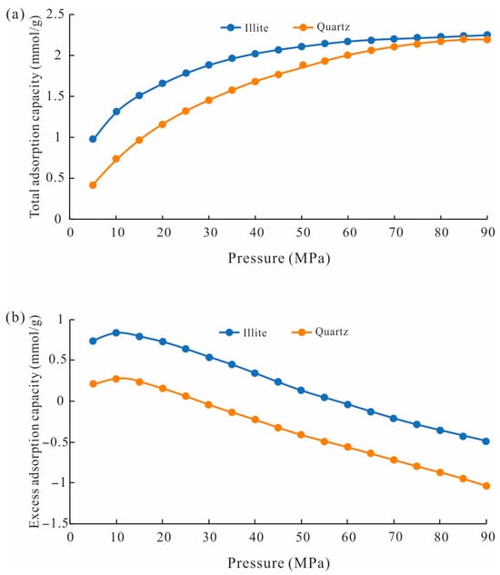 To investigate the influence of mineral type on methane adsorption capacity, methane adsorption curves for the 2 nm quartz and illite simulation models are generated based on the simulation results. As shown in Figure 15, there are differences between the adsorption capacities of quartz and illite: the adsorption capacity of quartz is lower than that of illite. Large differences in the total methane adsorption capacity are observed under low-pressure conditions. The total adsorption capacity of illite at 10 MPa is 1.297 mmol/g, while that of quartz is 0.775 mmol/g. As pressure increases, the difference in total adsorption capacity between illite and quartz decreases and eventually becomes consistent. The total adsorption capacity of illite is 2.25 mmol/g at 90 MPa, and that of quartz is 2.23 mmol/g. Additionally, the excess adsorption capacity of illite is greater than that of quartz. Both reached their maximum at 10 MPa: illite is 0.813 mmol/g, and quartz is 0.302 mmol/g, which is consistent with Chen et al. [38]. The excess adsorption curves of quartz and illite are basically parallel, with the quartz excess adsorption capacity becoming negative at 30 MPa, and illite at 60 MPa. This indicates that the density of the adsorbed methane layer in illite is higher than that in quartz. This phenomenon is related to the mineral properties of shale.