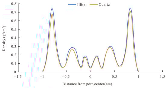 Figure 16 shows the methane density distribution curve for the illite and quartz simulation models. The adsorbed and free methane densities in illite slits are higher than those in quartz. Moreover, the methane isosteric heat in the illite simulation model is higher than that in quartz under the same conditions. This phenomenon proves that the adsorption capacity of illite is greater than that of quartz. This can be explained by the fact that the adsorption potential of silicon atoms is weaker than that of oxygen atoms [44]. Quartz contains more silicon atoms, which results in a weaker adsorption potential than that of illite, leading to a lower adsorbed methane density in quartz compared to illite.