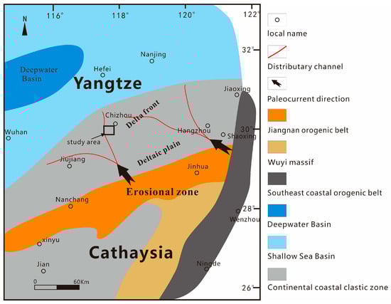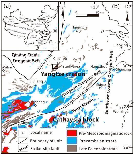 South China is divided into the Yangtze Block (craton) in the north and the Cathaysia Block in the south, with the Jiangshao Fault Zone as the boundary. The Wuyi Massif located in the Cathaysia Block and the Jiangnan orogenic belt located in the Yangtze Block (Craton) are distributed on both sides of the Jiangshao Fault Zone, while the southeastern coastal orogenic belt is distributed in the eastern region of south China (Figure 1). The formation of the Yangtze Block (craton) has gone through several major stages of tectonic evolution, including the formation of the Archean ancient land core, the formation of the Early–Middle Proterozoic ancient land block and craton basement, the formation of the Late Proterozoic–Paleozoic craton depression basin, the formation of the Mesozoic fault basin, and the formation of the Cenozoic continental margin foreland basin [41,42,43,44]. The Lower Yangtze region belonged to a cratonic intracontinental depression basin during the Paleozoic era and later underwent tectonic transformation from the Mesozoic to the Cenozoic era to form fault basins and foreland basins. During the Late Paleozoic era, the Dongwu Movement caused differential crustal uplift and large-scale seawater retreat in the Yangtze Block. The sedimentary environment in the Lower Yangtze region underwent significant changes from sea to land, but no large-scale volcanic activity occurred. The Lower Yangtze Basin and its surrounding areas are divided from north to south into the Jiaonan orogenic belt, Chuquan depression, Yangtze River depression, Wannan-Sunan depression, Jiangnan orogenic belt, and Qiantang depression [41,43]. The research area is located in the Yangtze River Depression in the eastern part of the Yangtze Craton (Lower Yangtze region).