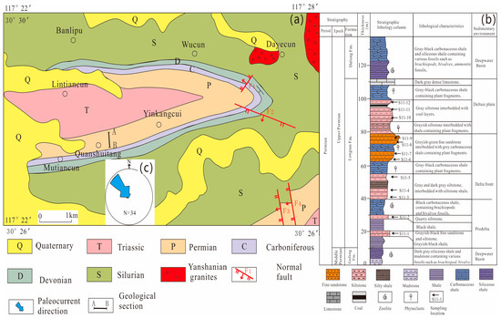 (a) Geological map of Chizhou area in Lower Yangtze Region (modified after 1:200,000 geological map in Anqing). (b) Stratigraphic framework of the Longtan Formation in the sampling location. (c) Paleocurrent direction for Longtan Formation in the study area.