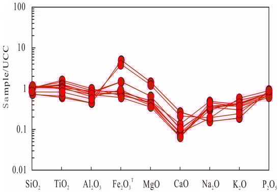 As shown in the central element-normalized distribution patterns (Figure 3), the concentrations of principal oxides such as SiO2, TiO2, Al2O3, Fe2O3T, MgO, CaO, Na2O, K2O, and P2O5 in the Longtan Formation sandstones from the Chizhou area are generally comparable to those of PAAS. Among these, SiO2, Fe2O3T, MgO, and Na2O content is relatively enriched, and some elements exhibit a wide range of variability. In contrast, TiO2, Al2O3, CaO, K2O, and P2O5 are comparatively depleted. These results suggest that the Longtan Formation sandstones in the Chizhou area of the Lower Yangtze region contain relatively low amounts of unstable components and mafic-related minerals, indicating a high degree of compositional maturity. The provenance is likely dominated by intermediate to felsic source rocks.
