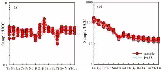 Longtan Formation sandstone and Late Precambrian Australian shale (PAAS) both belong to the clastic rock class. Based on the data table of trace element content in Longtan Formation sandstone in the Chizhou area (Table 2) and its UCC-normalized distribution pattern (Figure 4a), the abundance and distribution pattern of trace elements in the sample are generally consistent with those in PAAS. For significant large ion lithophile elements (LILEs), which are geochemically more mobile, Longtan sandstones display significant variation in the content of Sc, V, Cr, Rb, and Ba, all of which are notably depleted relative to PAAS and UCC values. In contrast, Ni, Co, Sr, and Sm content vary to a lesser extent and is consistently lower than both PAAS and UCC averages. High-field-strength elements (HFSEs), such as Nb, Ta, Zr, Ce, Pb, Hf, Th, and U, are typically chemically immobile and resistant to metamorphism, hydrothermal alteration, weathering, and diagenesis. In the Longtan Formation sandstones, Nb, Zr, Hf, Ta, Ce, Th, and U concentrations exhibit substantial variability and are generally depleted relative to PAAS and UCC benchmarks.