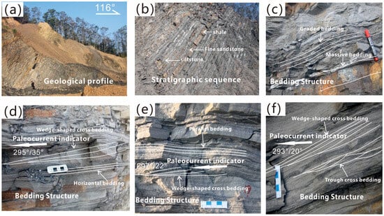 Paleocurrent indicators of the Longtan Formation in the study area. (a) Geological profile of the Longtan Formation. (b) Stratigraphic sequence of the Longtan Formation. (c) Bedding structures such as massive bedding and graded bedding. (d) Bedding structures such as horizontal bedding and wedge-shaped cross-bedding. (e) Bedding structures such as wedge-shaped cross-bedding and parallel bedding. (f) Bedding structures such as trough cross-bedding and wedge-shaped cross-bedding.