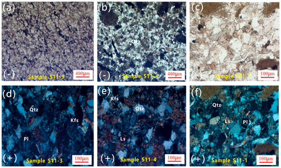To further constrain the compositional characteristics and provenance of the Longtan Formation, petrographic thin-section analysis was conducted on representative sandstone samples (Figure 6). Sample S11-3 (Figure 6a,d) shows a moderately sorted framework dominated by subangular quartz grains (Qtz), accompanied by plagioclase (Pl) and subordinate K-feldspar (Kfs), embedded in a compact matrix. Sample S11-4 (Figure 6b,e) displays relatively a number of lithic fragments (Ls) in addition to feldspar and quartz. Some minerals such as clay minerals and siderite mainly form the cement between clastic particles. This indicates derivation from intermediate to felsic igneous or sedimentary source rocks. Sample S11-1 (Figure 6c,f) contains a high proportion of angular to subangular quartz grains, plagioclase, and lithic clasts. It also contains a small amount of clay minerals and opaque minerals, mainly in the form of cement. Rocks have weak compaction and partial alteration characteristics.