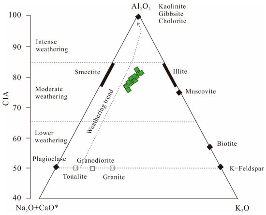 A-CN-K ternary diagram of major earth elements of sandstone from the Longtan Formation in the Chizhou area (diagram based on [49]). CaO* represents the Ca content derived from silicate minerals in the rock, calculated in terms of oxide molar mass; CaO* = CaO − P2O5.