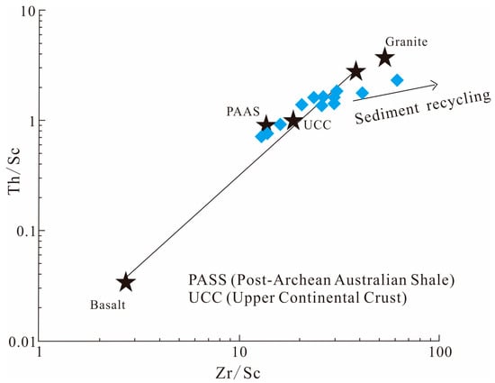 Th/Sc-Zr/Sc diagram of trace-earth elements of sandstone from the Longtan Formation in the Chizhou area (diagram based on [54]).