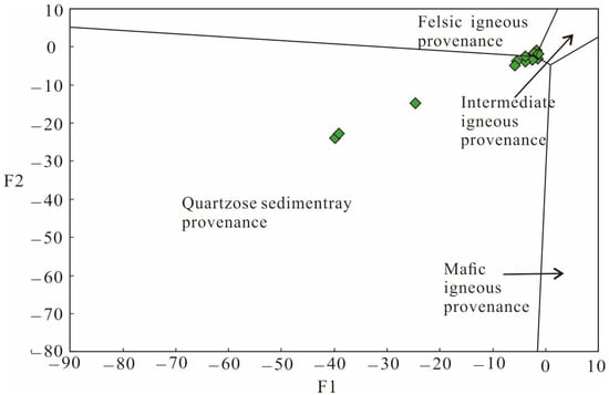 Provenance characteristics of sedimentary rocks can be inferred from multi-element geochemical discrimination diagrams [52,53]. Terrigenous clastic sediments are classified into four source categories: mafic volcanic, intermediate volcanic, felsic volcanic, and quartzose sedimentary provenance. They developed provenance discrimination functions based on the relationships among principal oxides such as Ti, Al, Fe, Mg, Ca, Na, and K. As shown in the F1–F2 (Table 1) discrimination diagram (Figure 9), most sandstone samples from the study area plot within the intermediate igneous provenance field, with a few falling into the mafic igneous provenance field. This suggests that the source area of the Longtan Formation sandstones in Chizhou may have been linked to a tectonically active region dominated by mafic to intermediate volcanic rocks. An Al2O3/TiO2 ratio greater than 14 in sedimentary rocks indicates a predominantly felsic provenance. As shown in Table 1, the average Al2O3/TiO2 ratio for the sandstone samples is 20.21, indicating that the Longtan Formation was mainly derived from felsic source rocks.