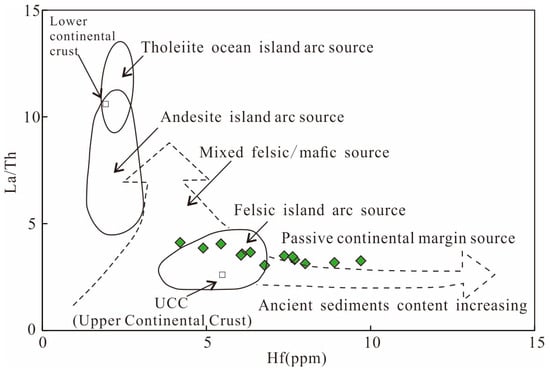 The La/Th–Hf diagram can be a reliable indicator for determining sedimentary provenance. Plotting the La/Th and Hf values of the Longtan Formation sandstone samples shows that most data points fall within the felsic provenance field, indicating an upper continental crustal source (Figure 10). The geochemical analysis was performed using an open-system four-acid digestion method, which may not completely dissolve refractory minerals hosting Hf and Zr. As a result, the measured concentrations of Hf and Zr may be underestimated and should be interpreted cautiously. When adjusting the Hf concentrations upward to compensate for potential underestimation, the data points remain within the felsic provenance region, trending toward a passive continental margin source. These results suggest that the Longtan Formation in the Chizhou area was predominantly derived from felsic upper continental crustal rocks.