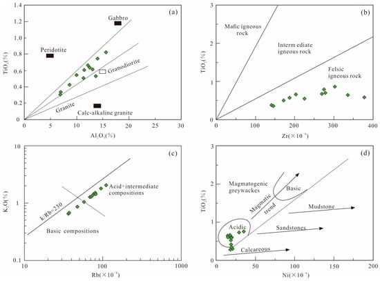 Geochemical classification of sandstones of Longtan Formation in the Chizhou area. (a) TiO2-Al2O3 diagram (diagram based on [57]); (b) TiO2-Zr diagram (base diagram after [58]); (c) Rb-K2O diagram (diagram based on [54]); (d) Ni-TiO2 diagram (diagram based on [59]).