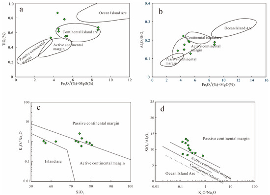 Tectonic setting discrimination on major elements of the sandstones from Longtan Formation in the Chizhou area ((a,b) diagram based on [55]; (c,d) diagram based on [52]).