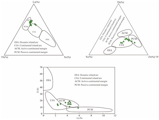 Combinations of trace elements such as La, Co, Nd, Y, Th, Zr, Hf, Nb, Ti, and Sc in clastic sedimentary rocks can distinguish tectonic settings [65]. Specific trace element discrimination diagrams differentiate four tectonic settings: oceanic island arc, continental island arc, active continental margin, and passive continental margin [65]. The trace element data of Permian sandstones from the Longtan Formation in the Lower Yangtze region were plotted on Ti/Zr–La/Sc, La–Th–Sc, and Th–Sc–Zr/10 diagrams (Figure 13). The results indicate that the provenance of the Longtan Formation sandstones is predominantly related to active continental margin and continental island arc settings, with minor influence from passive continental margin environments.