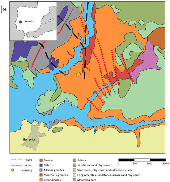 The Benavila igneous massif was formed during the Lower Silurian [26,27], and it is characterized by the diversity of petrologic types: granites, granodiorites, monzonites, quartz diorites, and, exceptionally, olivine gabbros. Granitoids, quartz diorites, and gabbros have a common characteristic: the presence of green-colored hornblende amphiboles. The massif is cut by numerous veins, running NW-SE, which are mostly constituted of granite. In addition to the aforementioned veins, there are also many enclaves of felsic nature, namely monzonites, always more basic than the surrounding granitoids. The entire massif is also affected by carbonated alterations of Paleogene–Quaternary age, due to the high content of carbonates in the groundwater [24]. Chemically, the global composition of these rocks located at the Benavila igneous massif is mainly constituted by SiO2, Al2O3, Fe2O3, and CaO, representing at least 75% of the total oxide content [24].