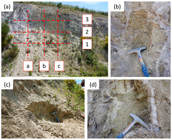(a) General photograph of the outcrop and sampling grid, showing the horizontal profiles (1, 2, 3) and the vertical profiles (a, b, c). (b) Bentonite sample with part of the original texture preserved. (c) Bentonite sample without preserved original texture. (d) Carbonate vein.