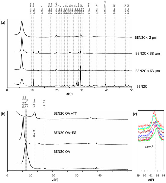 Powdered samples from all the granulometric fractions were characterized by XRD, as well as the air-dried aggregates of <2 microns fractions, which allowed identifying the mineral assemblages within them (Figure 3). Powdered samples allow the identification of phyllosilicates, carbonates (mainly calcite, along with minor amounts of dolomite), and scarce quantities of tectosilicates (quartz, K-feldspar, and plagioclase) (Table 1). The rest of the minerals identified are always present, just at trace levels. These results agree with previous references [29,30]. Amphiboles were also identified, but only in samples belonging to the C vertical profile (Figure 2). The diffractograms corresponding to the finer granulometries (<63, <38, and <2 µm) show that the relative intensities of phyllosilicates increase compared with the other minerals identified, indicating a preferential concentration of phyllosilicates in the fine-grained fraction, as expected. The oriented aggregates (OA) and their treatments grant the capacity of studying clay minerals in more detail, being able to identify smectite as the main component along with traces of illite, chlorite, and possible kaolinite. Small amounts of a mixed-layer of chlorite and smectite (C/S) have also been identified due to the presence of a reflection at 12.4 Å that does not collapse in the AD + TT [45]. Also, in the OAs, there are small inflections at 12.3 Å (Figure 3b), which indicate a possible mixture of smectites with different predominant interlayer cations, ratified by their swelling in the OA + EG treatment. The dioctahedral character of the smectites was identified due to the d-spacings of the (060) reflections, whose values range between 1.499 and 1.507 Å, and in all the samples studied (Figure 3c).