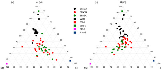 The structural formula obtained from both the non-homoionized and homoionized samples was used to obtain a ternary plot of the octahedral content (Mg, Fe, Al) of all the analyses, along with the octahedral content of different smectite samples from the literature [38,50,51] (Figure 5). The ternary plot of the octahedral content of non-homoionized samples shows different tendencies for Benavila samples. BEN3A is the most enriched in aluminum, therefore, being the closest to both beidellite and montmorillonite. Samples BEN3B and BEN3C display higher compositional dispersion and show higher contents of iron, which in some cases bring them close to the nontronite octahedral content. However, when the homoionized octahedral content is plotted, it is easily observed that no analyses fall near the notronite octahedral content but rather fall in intermediate fields. There is also an evident trend that can be observed in both ternary plots, which is a progressive transformation towards purest dioctahedral smectites from the BEN3C to the BEN3A sample, due to the progressive loss of magnesium and iron.