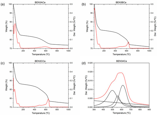 (a) TGA (%) (black) and DTA (%/°C) (red) of sample BEN3ACa; (b) TGA (%) (black) and DTA (%/°C) (red) of sample BEN3BCa; (c) TGA (%) (black) and DTA (%/°C) (red) of sample BEN3CCa; (d) Deconvolution of the DTG curve between 300 and 900 °C of sample BEN3ACa, showing the different functions considered (black) and the resulting model (red).
