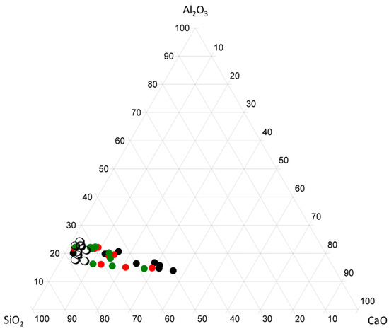Ternary plot representing the values of SiO2, Al2O3, and CaO. Black: bulk rock samples; Red: <63 µm fraction; Green: <38 µm fraction; Blank: <2 µm fraction.