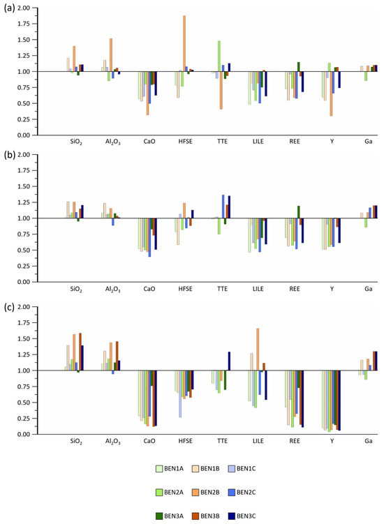 (a) Enrichment in the <63 µm fraction respect the bulk rock sample of the represented oxides and elements; (b) Enrichment in the <38 µm fraction respect the bulk rock sample of the represented oxides and elements; (c) Enrichment in the <2 µm fraction respect the bulk rock sample of the represented oxides and elements.