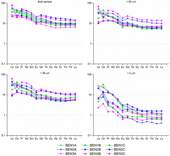 The REE present lower concentrations in the samples with higher contents in phyllosilicates (Figure 8, Table 4 and Table S8), something that can be attributed to their low solubility and their preferential accumulation in the coarser fractions in trace minerals as zircons [68]. However, there is another mechanism that can potentially affect the REE content: their complexation due to the action of carbonate-rich fluids and possible precipitation within calcite veins [69,70,71]. After chondrite normalization [72] (Figure 9), all samples are enriched both in light REE (LREE) and heavy REE (HREE). The fact that, in the majority of the clay size (<2 µm) fractions, the HREE are much lower than in the other fractions may partially explain the negative correlation between REE and smectite. All the samples studied show negative Eu anomalies. Two samples from the B profile have significant negative Ce anomalies in bulk and silt size fractions. In the clay size fractions, a tendency for positive anomalies was found.