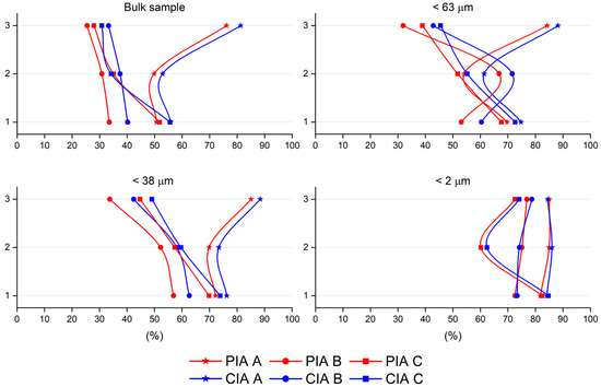 Despite the expected decline in the PIA and the CIA values from the top to the bottom of the vertical profile due to the field interpretation, it is possible to observe an increase in the values of the indices from top to bottom, indicating more weathered materials at the base of the deposit. However, there is an exception, the A profile, which shows higher values at the top. This can be related to the fracture system running in the NNE–SSW direction that seems to have favored the weathering [26], since it is possible that those fluids came from the NNE and affected the A profile in a slightly different manner. A clear link between the alteration indices and the amount of primary minerals (tectosilicates and amphiboles) is observed. The variation along the horizontal levels shows values that are typically higher towards the A profile, although the B and C profiles have higher variability in their values. The circulation of the carbonated fluids, especially in the B profile, affects the resulting CIA and PIA indices (even after the neglection of the Ca contained within carbonates by the use of the CaO* for their calculation), obscuring their true values and making it challenging to determine the weathering pathways of the deposit (Table 5, Figure 10). When calculating these indices for the finer granulometries, it is possible to observe how the influence of the carbonated fluids is progressively less important (as indicated by their higher values), especially at the <2 µm fraction, which is essentially formed of phyllosilicates. However, these fluids still have some influence on the calculated indices.