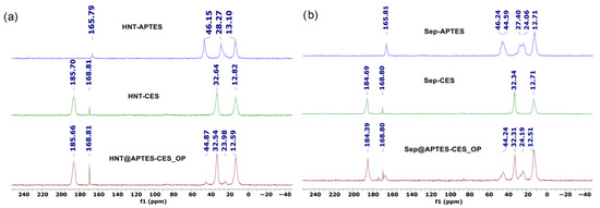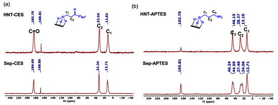 13C CP MAS NMR spectra of (a) HNT-CES and Sep-CES and (b) HNT-APTES and Sep-APTES.