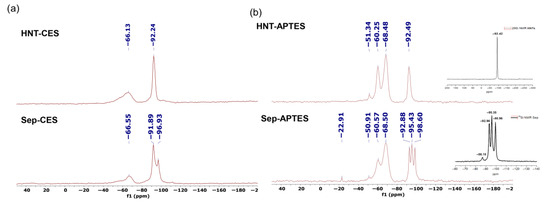 29Si CP MAS NMR spectra of (a) HNT-CES and Sep-CES and (b) HNT-APTES and Sep-APTES.