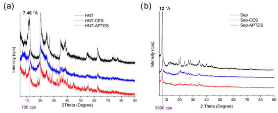 X-ray diffraction (XRD) of HNT, HNT-CES, and HNT-APTES shows that the basal distance has not been modified after functionalization, since the main diffraction peak seen at 2θ = 11.8°, corresponding to d = 0.74 nm, was kept intact (Figure 5a). This implies that the grafting does not take place within the galleries, which further consolidate the occurrence of the attachment at the Al–OH groups of the lumen surface (tube inner surface) and the Al–OH and Si–OH groups at the edges and external surface defects of nanotubes [50]. This could be explained by the inaccessibility of the Al-OH groups of the interlayer because of the strong hydrogen bonding interactions between the sheets [33,50]. A similar trend was also observed for sepiolite, since no alteration of the basal distance could be noticed after surface functionalization (Figure 5b) [52,53]. Nevertheless, a decrease in peak intensity was observed for silylated clay. This could be due to the formation of covalent bonds between the hydroxyl groups of clay and the organosilane producing structural distortions and consequently decreasing the layer stacking order [54].