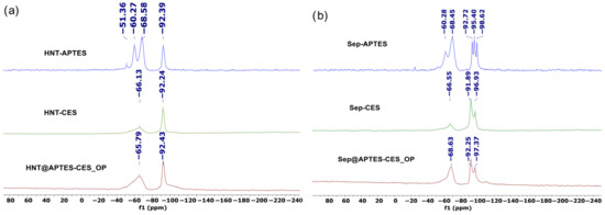 29Si CP MAS NMR spectra of HNT@APTES-CES_OP shows the appearance of the signal at −92.43 ppm characteristic of the Q3 silicon atom of the pristine clay. A new broad signal was also observed at −65.79 ppm, corresponding to a T3-type silicon atom of the organosilane bonded to the halloysite surface (Figure 7). For sepiolite, a new signal appeared at 68.48 ppm, corresponding to the silicon atom of the organosilanes bonded to the clay surface with three siloxane bonds (T3). The appearance of the T group in the 29Si NMR of bifunctionalized clay clearly demonstrates the successful grafting of organic functional groups into the clay structure [56].