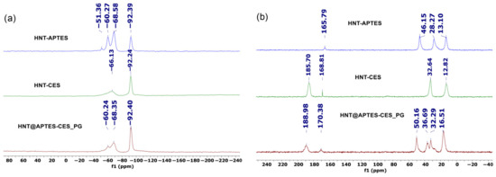 Solid-state 13C CP MAS NMR of the sequentially grafted halloysite HNT@APTES-CES_PG shows characteristic signals of the APTES agent including the ones at 16.51 and 50.16 ppm, attributed to the remaining and non-condensed ethoxyl group. The spectra also display typical signals of CES at 32.3 and 188.9 ppm, attributed, respectively, to -CH2- and C=O belonging to CES (Figure 9b). A substantial increase in the signal of grafted APTES was moreover noticed compared to the one observed during the one-pot method, indicating that sequential post-grafting allows for anchoring more APTES on the surface of halloysite.
