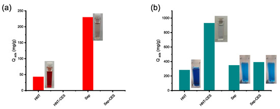 Adsorption capacity of HNT-CES and Sep-CES for Congo red (a) and malachite green (b).