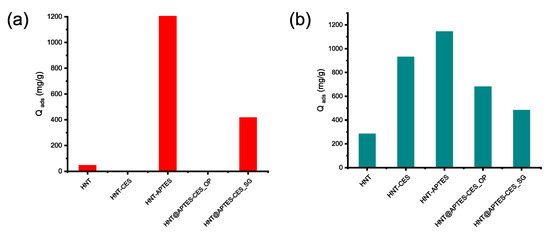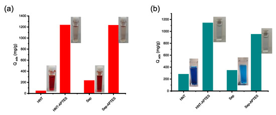 Compared to HNT-CES and Sep-CES, a diverging pattern was instead observed for HNT-APTES and Sep-APTES when comparing their adsorption towards CR and MG. In the two cases, the amino-modified clay exhibits significantly enhanced adsorption capacity towards both the anionic and cationic dyes compared to the parent clay (CR and MG) (Figure 11). Indeed, the adsorption capacities obtained for HNT-APTES and Sep-APTES were 1232 and 1228 mg/g for Congo red, being 29.3 and 5.4 times higher than those achieved for HNT and Sep, respectively, and 1139 and 948 mg/g for malachite green which are, respectively, 4 and 2.8 times higher than those observed for HNT and Sep (Supplementary Material S7).