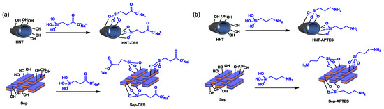 Silylation of HNT and Sep with (a) carboxy methyl silanetriol silane (CES) and with (b) aminopropyltriethoxysilane (APTES).