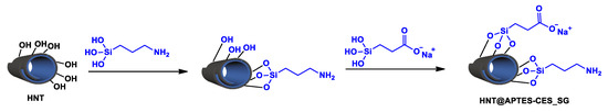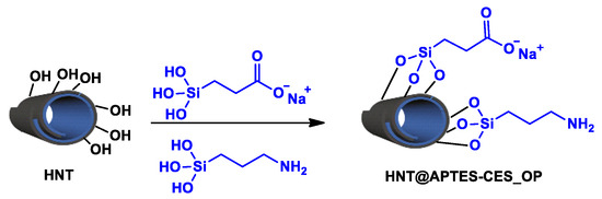 The first method consists of the simultaneous introduction of carboxysilantriol (CES) and aminopropyltriethoxysilane (APTES). The resulting material was denoted as HNT@APTES-CES_OP, where OP stands for one-pot (Scheme 2).