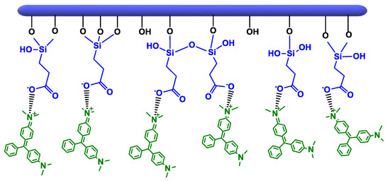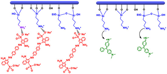 The removal efficiency of anionic dye (CR) obtained by clay-APTES was slightly greater than that of cationic dye (MG). This is due to the basic character of terminal NH2 groups that are prone to protonation to become positively charged (–NH3+), either by interacting with clay surface or once immersed in water solution [60,61,62,63]. The occurrence of electrostatic interactions between protonated amine and negatively charged sulfonate of CR provide the driving force for its uptake from water solution [64]. The adsorption of the cationic dye on HNT-APTES and Sep-APTES occurs rather through the non-protonated amine groups of APTES, which behave as a Lewis base by sharing their non-binding electron doublet with the positively charged dye molecule (Scheme 5).