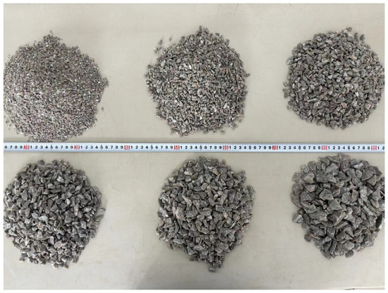 The low-grade copper ore utilized in this study was sourced from a copper mine located in Hubei Province, China. The average grade of the ore sample was 0.49%. Elemental composition analysis was performed using X-ray fluorescence (XRF, Axios, PANalytical, Almelo, The Netherlands), with the results summarized in Table 1. To investigate the effects of particle size and gradation on the pore structure of the ore bulk, single-size copper ore particles and particles with varying gradations were employed for comparative analysis. This study specifically examined the influence of particle size and gradation on the internal pore structure characteristics of the fill material. The copper ore particles were prepared through crushing, screening, washing, and air-drying processes. Subsequently, the particles were classified by size using a sieve analysis technique. Representative samples of the copper ore particles are presented in Figure 1.