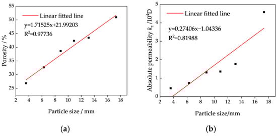 Relationship between porosity, permeability, and average particle size of single-stage ore bulk: (a) relationship between porosity and average particle size; (b) relationship between permeability and average particle size.