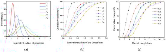 As depicted in Figure 7c, the average throat length of models G1–G4 demonstrates a gradual increase with increasing particle size, whereas the average throat length of models G5 and G6 is markedly larger compared with the previous four models. The curve for model G1 rises the most steeply, followed by G2, indicating a higher prevalence of short throats in these models. The cumulative change curves for the throat sizes in models G3 and G4 are comparable. These observations suggest that as particle size increases, the number and percentage of long throats increase substantially. Throats exceeding 11 mm in length are virtually absent in models G1 and G2, while they account for approximately 5% in models G3 and G4, and exceed 20% in models G5 and G6. Long throats tend to prolong the flow time of solutions within them, which may hinder solution penetration. However, a comprehensive evaluation should consider throat size in conjunction with pore size.
